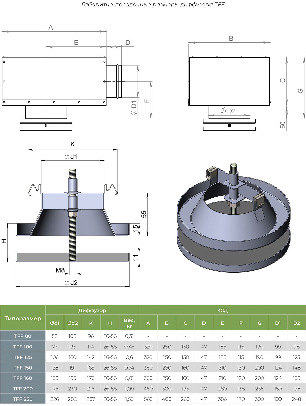 TFF - это приточный диффузор для потолочной установки. TFF состоит из впускного конуса и центрального диска со звукоизоляционной вставкой. Техническая спецификация диффузора обеспечивает широкий спектр применения. Расход воздуха и перепад давления могут быть плавно настроены, путем вращения центрального диска. Данный диффузор имеет экранирующее устройство для получения направленного (180°) распределения и возможность регулировки зазора. При использовании экранирующего устройства может быть выбрана как концентрическая, так и эксцентрическая распределительная модель.