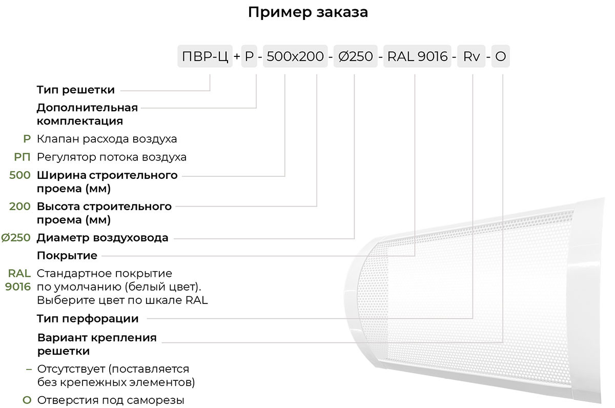 Рамка решетки имеет цилиндрическую форму, повторяя круглую форму воздуховода, при этом посадочная часть имеет прямоугольную форму под размер строительного проема. В рамку устанавливается перфорированный лист из оцинкованной стали.