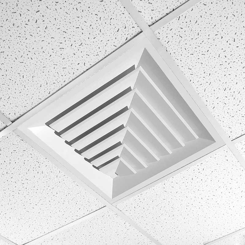 Потолочная решетка 2ПРМ предназначена для распределения воздушного потока внутри помещения в одну сторону, а при установке клапана расхода воздуха (модель 2ПРМ-Р) регулирует объем поступающего в помещение воздуха. Следуя из названия потолочные решетки устанавливаются в основном в потолок, как правило, типа Армстронг, размеры решетки соответствуют размеру потолочной ячейки.